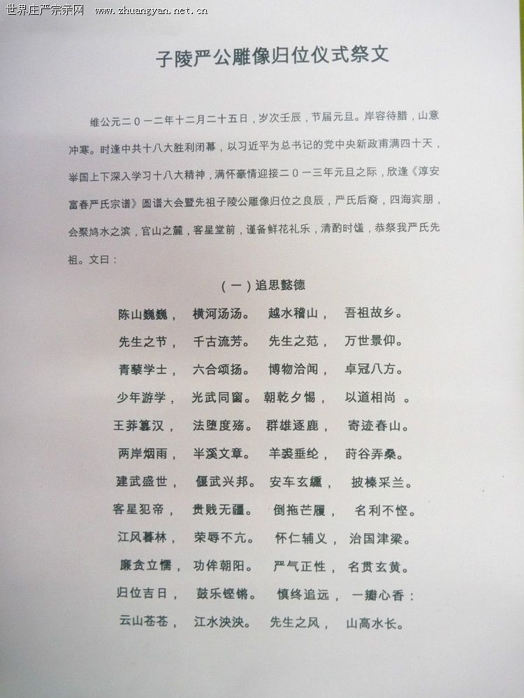 浙江淳安严氏宗祠:子陵严公雕像归位仪式祭文